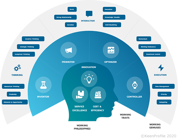 KEEN Career Finder Report is the innovation to unlock your full potential through your career development. The model is focused on how to help you understand your Working Geniuses and Working Traits to define what job-functions are fit with you. Also, it will help you understand your Working Philosophies; then you can also realize which businesses and companies will fit with you.